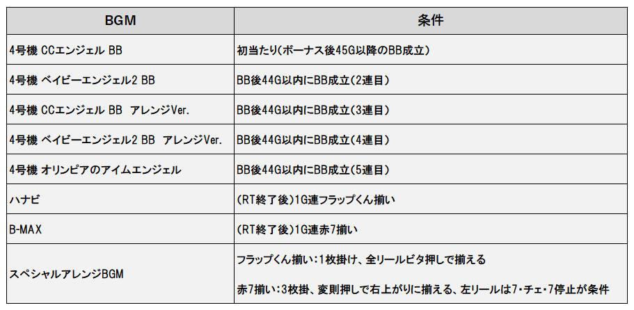 1G連以外にも連荘や揃え方でBGM変化が発生する。尚、連荘時にRBを引いた場合はRB終了後44G以内に条件が変化する。