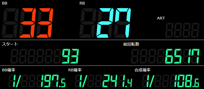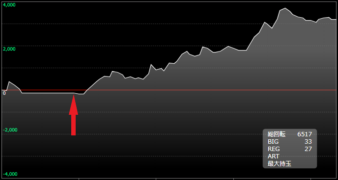 21時頃に出玉は4,000枚弱に到達し、この日のピークを迎える。ここからBB間で1000G以上ハマってしまいピークから出玉を削られるも、3,000枚以上の差玉を獲得して閉店終了。はじめ1/1000ほどだったRB確率もゲーム数を重ねる度に良くなり、結局閉店時には設定6以上の数値となっていた。