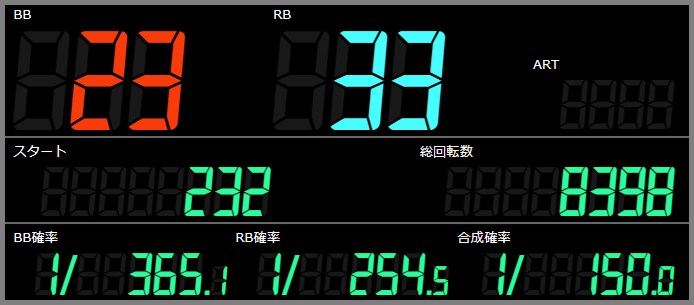 単独BBは設定1以下、単独RBは設定6より少し悪い1/350だったよ。