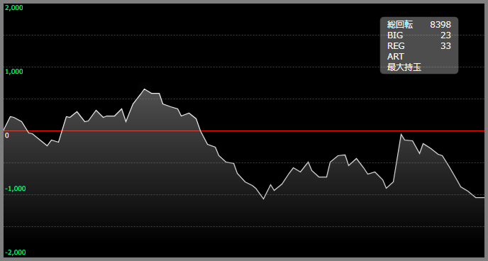 9連続RBで前半の出玉を飲まれマイナス域に突入。その後もプラス域には浮上せずノーマネーでフィニッシュです。