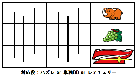 尚、ビタ押しをミスった場合はハズレ or ブドウ or 単独BB or チェリー重複BBと成立役を絞り難くなってしまうので注意が必要だ。