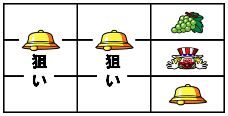 中リールをフリー打ちし、ブドウが非テンパイの場合はボーナスの2確目となる。この場合はチェリー重複の可能性が残っているので、左リールにはチェリーを狙う。注意点として本機はボーナス優先制御のため、中リールでボーナスがテンパイした場合は左リールでチェリーを蹴って7図柄を引き込む可能性がある。そのため、7図柄を引き込まない範囲でチェリーをフォローする必要がある。