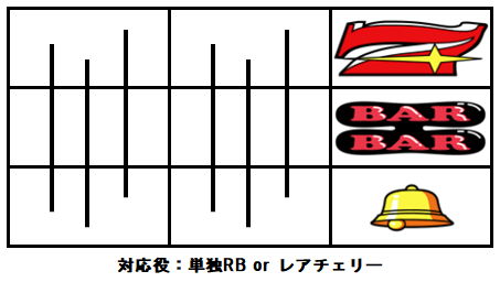 ビタ押しをミスって7図柄を1コマ早く押してしまい、7図柄が上段にビタ止まりした場合は単独RB or レアチェリーが成立している。レアチェリーの確率は低いため、チェリーは狙わずに残りリールは7図柄を狙ってそのままボーナスを揃えよう。