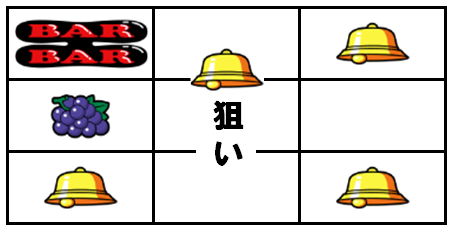 挟んで右リール適当打ち後、ブドウ・ベルの平行Wテンパイで小役目となる。中リールにベルを狙って小役が外れればボーナス確定となる。