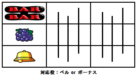 BAR図柄が中段に停止した場合の成立役はハズレ or ブドウ or ピエロ or ボーナスとなる。